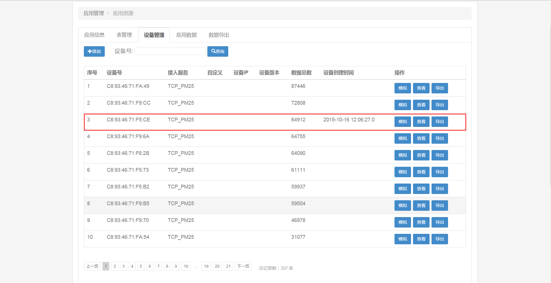 查看应用下所有设备,点击查看按钮可查看该设备入库数据